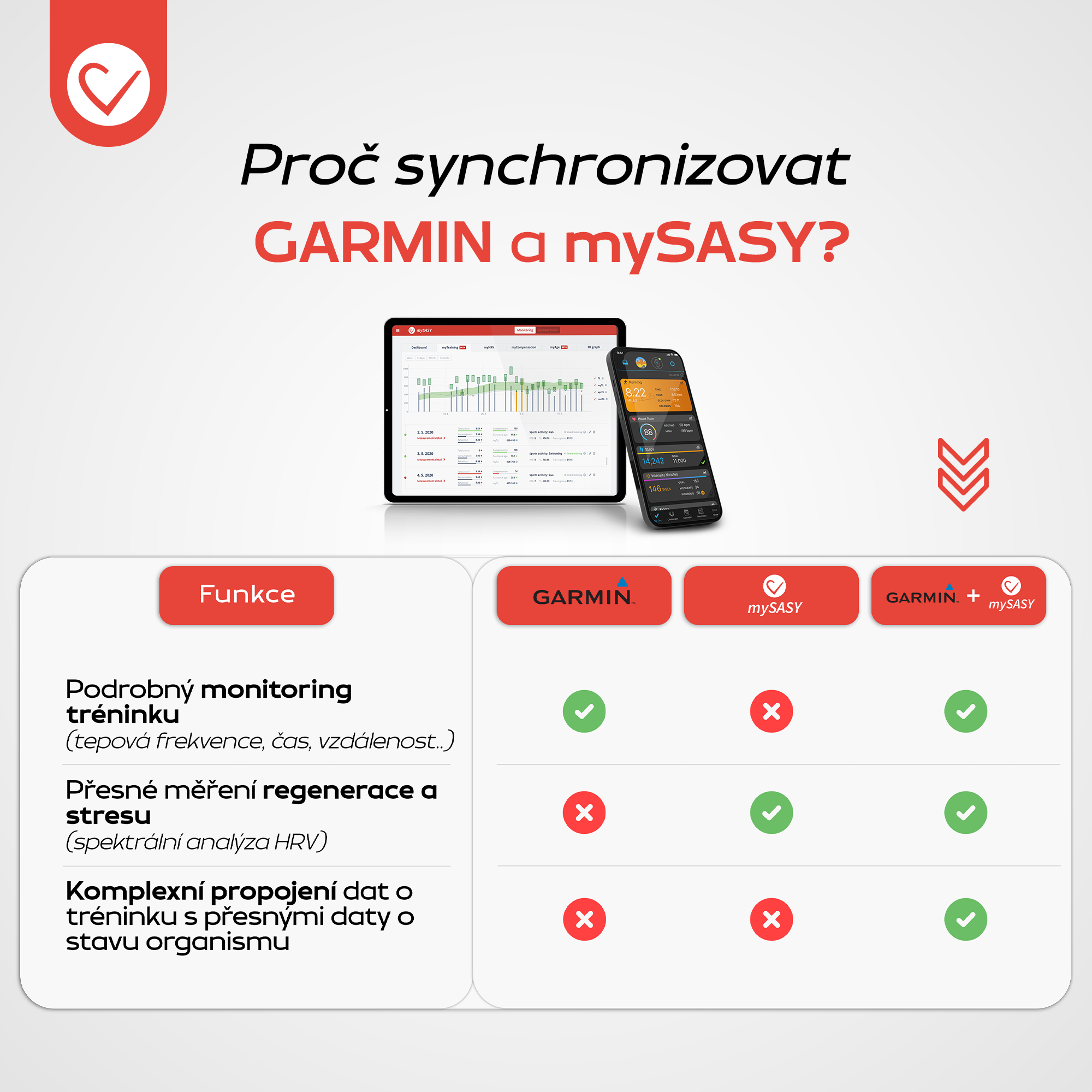 Zareagovali jsme na podněty našich uživatelů a sportovců s dobrým povědomím o tréninku a zařízeních využitelných pro jeho řízení a jejich poptávku po integraci s monitory tréninkového zatížení, mezi které patří i populární hodinky a monitory Garmin. Poslední verze aplikace mySASY umožňuje jednoduchou synchronizaci údajů o tréninku přímo ze systému Garmin.